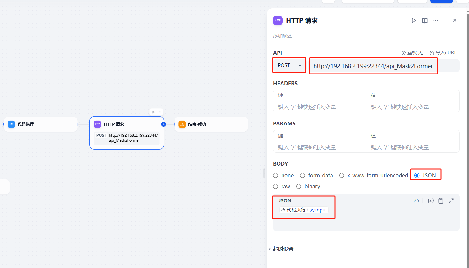 在代码节点后,直接编辑一个http节点,注意依次选择这几项,JSON选项直接使用dify的空间变量选刚才的代码节点~: